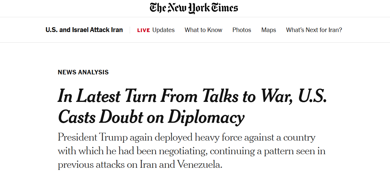 Ihrerseits weist die New York Times auf einen beunruhigenden Trend hin: Es ist bereits das dritte Mal, dass die Vereinigten Staaten militärische Gewalt gegen Länder einsetzen, mit denen sie gleichzeitig verhandeln. Die Trump-Regierung tat dies im Juni 2025 bei ihrem vorigen Angriff auf Iran und im Januar 2026 mit der Inszenierung der Entführung des venezolanischen Präsidenten Nicolás Maduro. Die NYT zitiert dazu den ehemaligen OSZE-Generalsekretär und Schweizer Diplomaten Thomas Greminger: